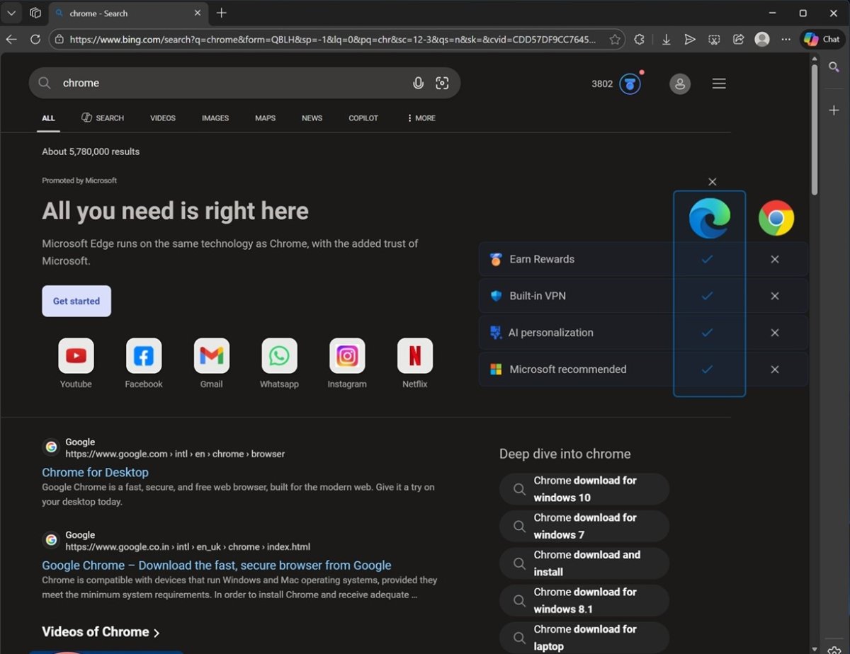 Wie vandaag Bing.com opent en zoekt naar “Google Chrome” of zelfs “Google”, krijgt vrijwel direct suggesties om Microsoft Edge te blijven gebruiken. Bing benadrukt daarbij zogenoemde voordelen van Edge, zoals: