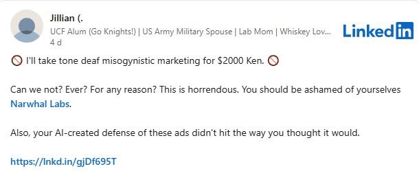 Narwhal Labs reageerde met een verklaring waarin het bedrijf enerzijds begrip toont voor de kritiek, maar anderzijds vasthoudt aan de kern van de boodschap. Volgens het bedrijf was het nooit de bedoeling om vrouwonvriendelijk over te komen, maar wil het juist een debat aanwakkeren over de rol van AI in de samenleving.